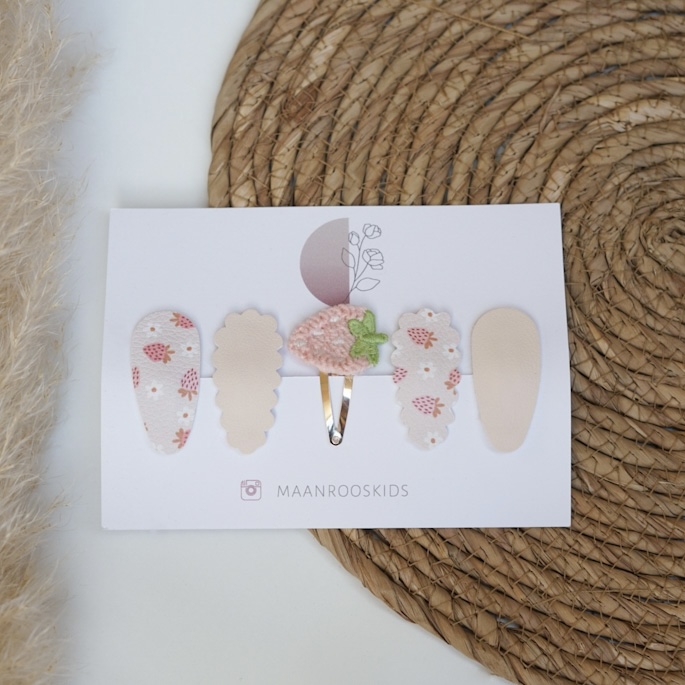 Set Flore – Strawberry Roze bestaat uit 5 diverse, lieve haarclips voor meisjes, bevestigd op een klikklak speldje.