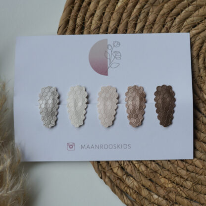 Set Fien – Nudes bestaat uit 5 lieve haarclips voor meisjes, bevestigd op een klikklak speldje. De speldjes hebben een ribbelrandje.